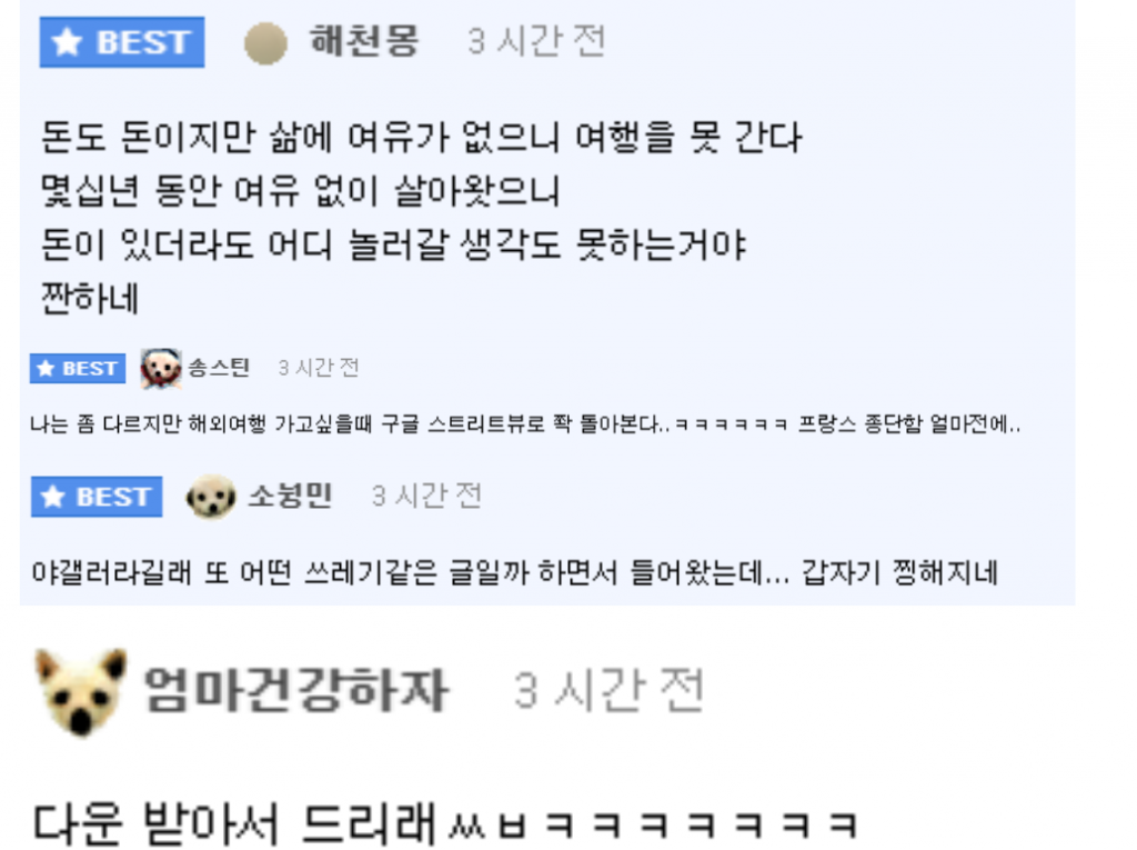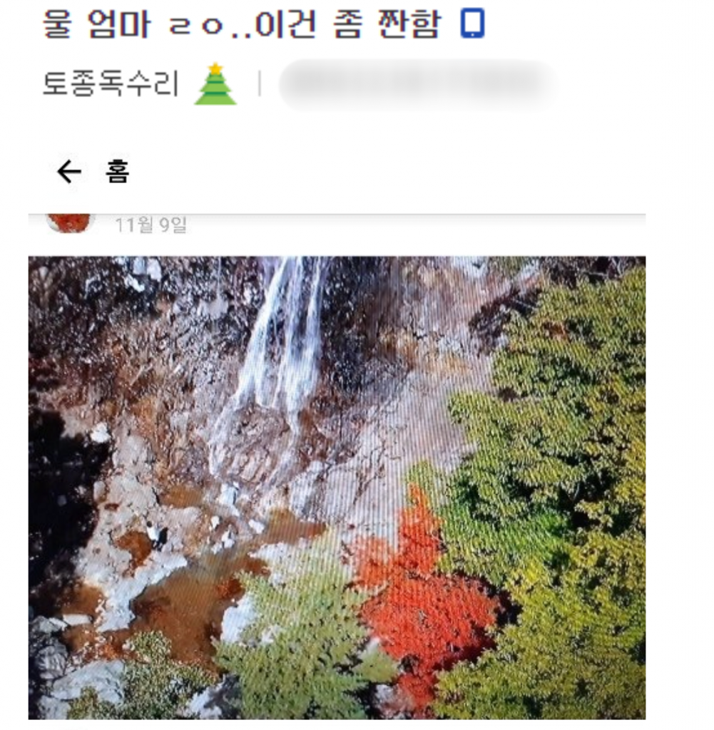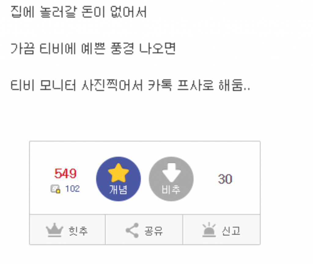 “집에 놀러갈 돈이 없어서 가끔 티비에 예쁜 풍경 나오면 티비 모니터 사진찍어서 카톡 프사로 해둠..”