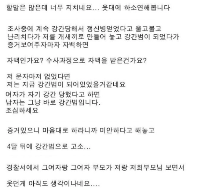 이에 네티즌들은 “뭐 성.관계 할 때 진짜 증거 수집해놓고 해야하나 이젠”, “강.간범 낙인 진짜 한순간이다.. 근데 오명 벗기는 왜이렇게 힘드냐”, “진짜 고생 많았다..”등의 반응을 보였다.