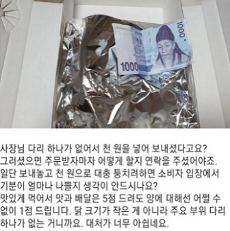 얼고보니 고객은 주요 부위로 뽑히는 닭다리 하나가 부족한 치킨을 천원이라는 지폐와 함께 받은 것이다.