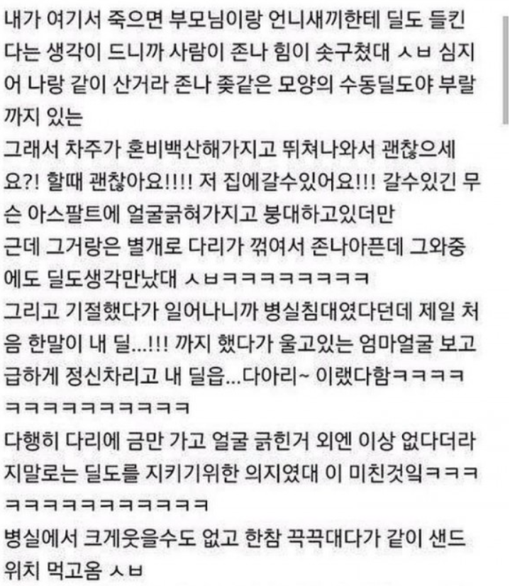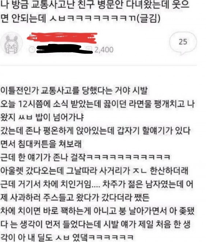 “나 방금 교통사고 난 친구 병문안 다녀왔는데 ㅋㅋㅋㅋㅋ”라는 제목의 글은 많은 누리꾼들을 폭소케했다.