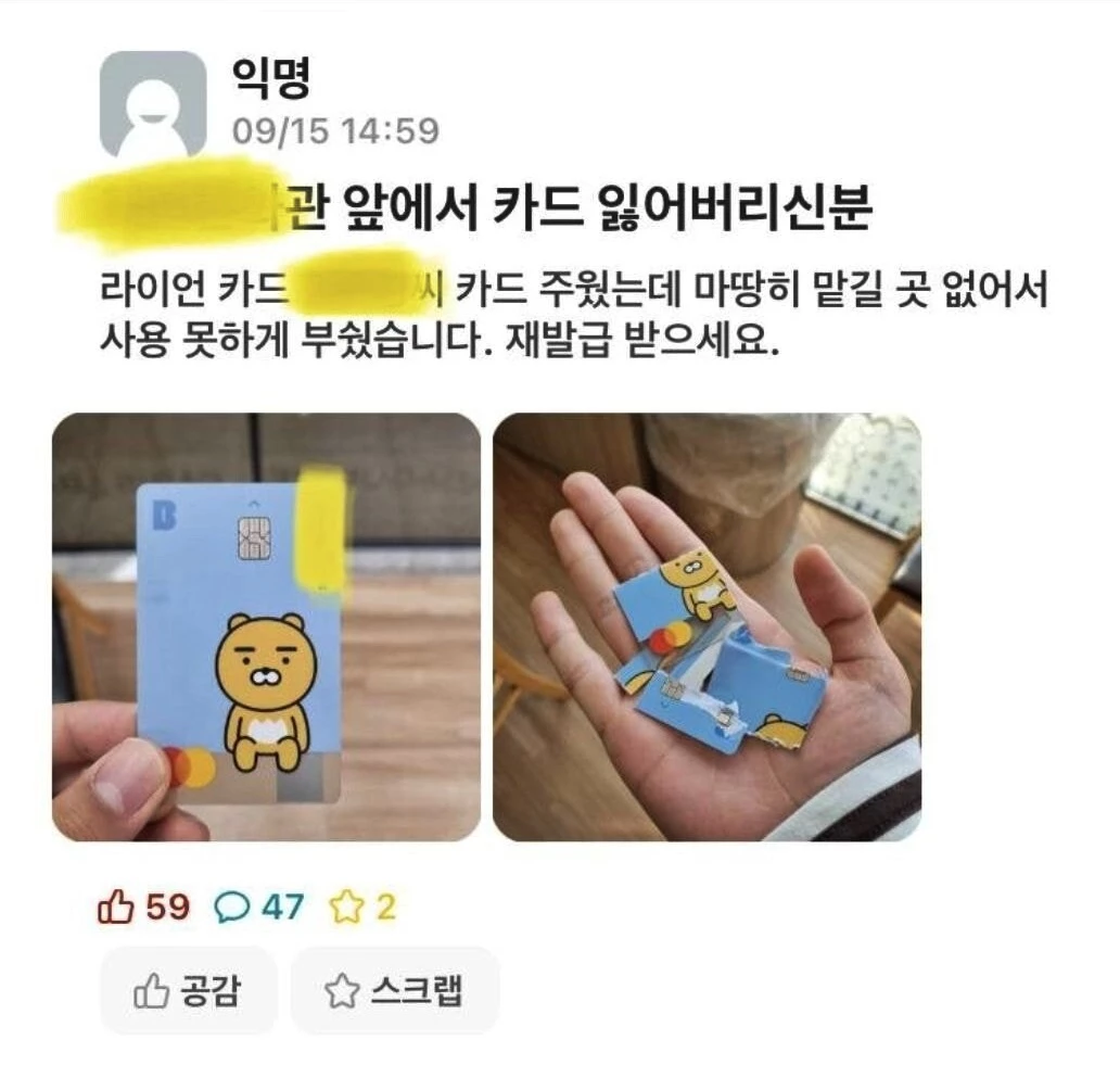 그는 “라이언 카드를 주웠는데 마땅히 맡길 곳이 없어서 사용 못 하게 부쉈다. 재발급 받으세요”라고 말했다.