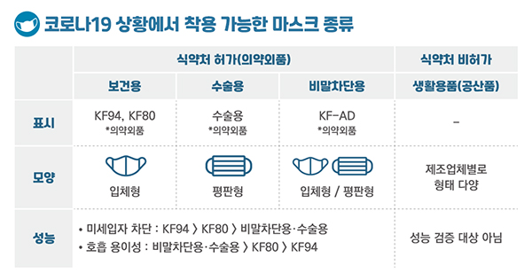 일반적인 상황에서는 수술용 마스크나 KF-AD 비말차단용 마스크로도 충분하다고 한다의사의 상세설명. 식약처에서는 의약외품 마스크가 없을때에는 짧은 시간에 한해 천 마스크나 일회용 마스크 등과 같은 공산품 마스크도 어느정도 도움이 된다고 하지만, 비말 차단 성능이 공식적으로 입증되지 않았기 때문에 주의가 필요하다고 한다.