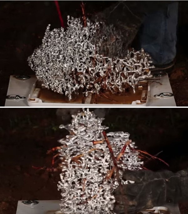 그러자 알루미늄이 굳어 개미집처럼보이는 작은 형태가 드러났다.