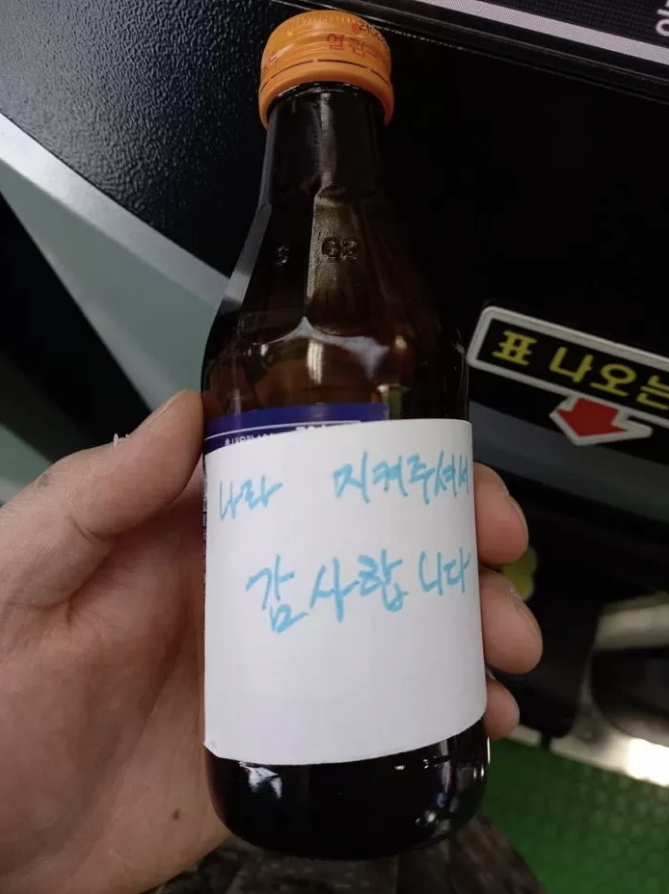 그가 공개한 사진 속에는 음료수에 “나라 지켜주셔서 감사합니다”라는 손편지가 붙어있었다.