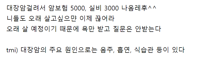 글쓴이는 “돈을 받은 이유는 바로 대장암에 걸려서 보험비로 8000만 원을 받은 것이다.”, “여러분들은 오래 살고 싶다면 술, 담배 그만하시고 식습관도 잘하셔야 합니다.”라며 이야기를 마쳤다.