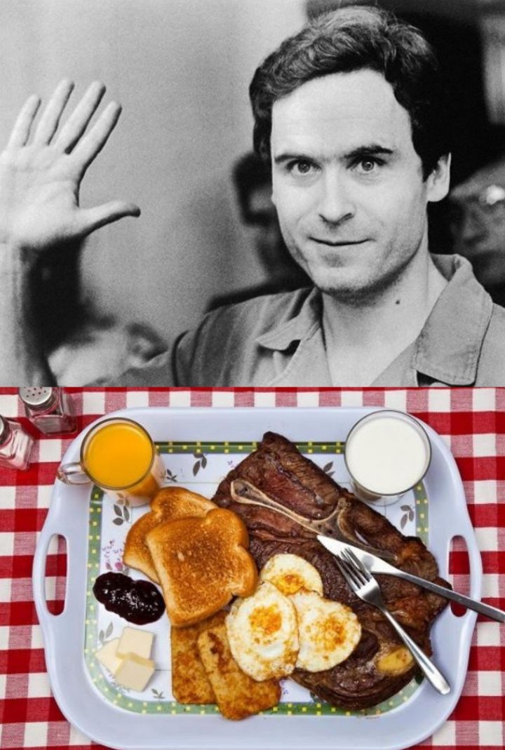 1974년에서 1978년까지 4년 동안 수많은 젊은 여성들을 살해한 테드 번디는 사형선고를 받고 사망 전 마지막 식사를 거부해, 임의로 제공되는 해시브라운, 버터, 딸기잼, 구운 식빵, 달걀 프라이, 스테이크, 오렌지 주스 등을 먹고 전기 의자에서 죽었다.