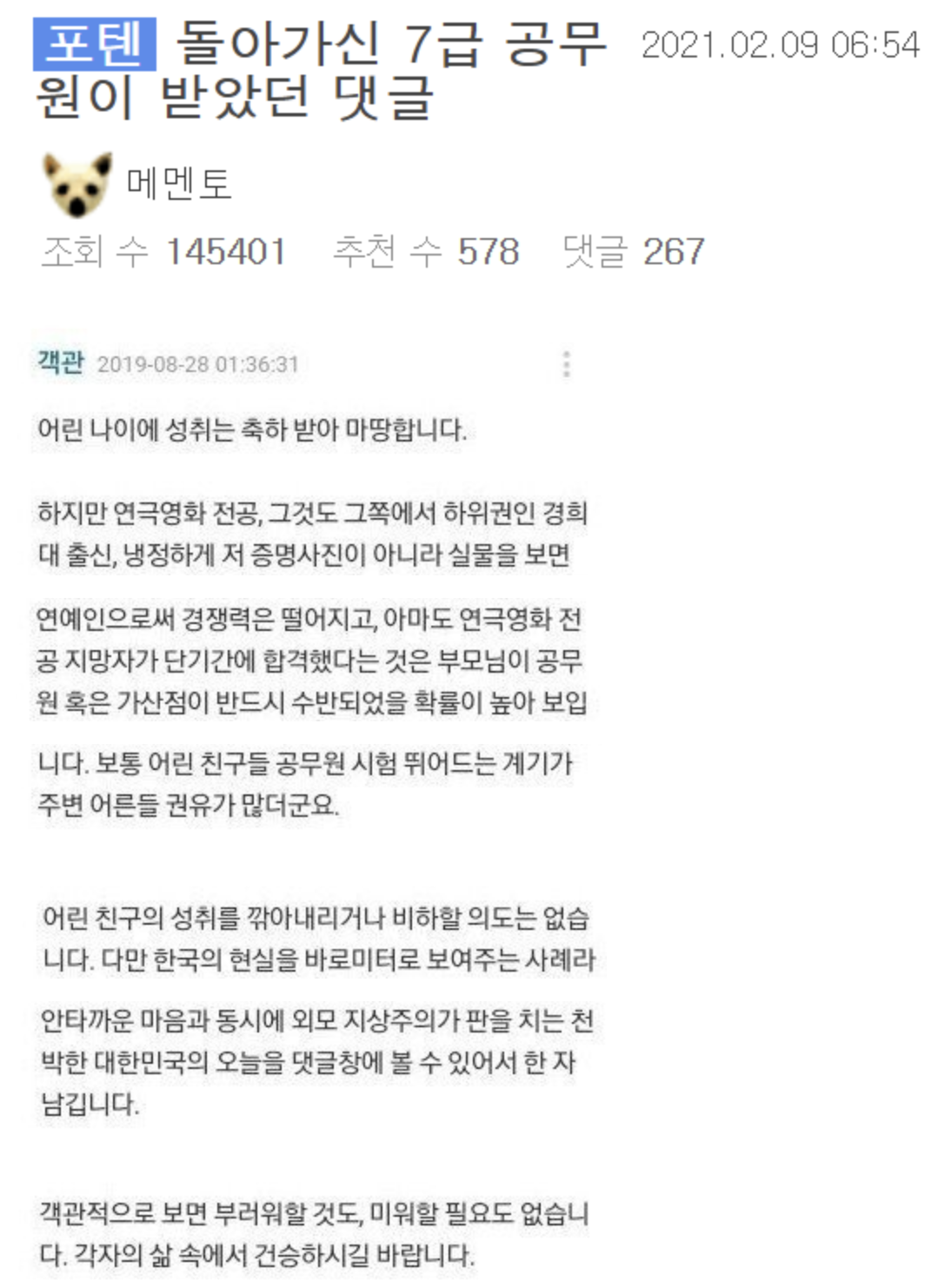 그는 다소 이른 나이에 공무원시험에 합격해 직장 내 괴롭힘으로 힘들어 했다는 소식이 전해진 바 있다.