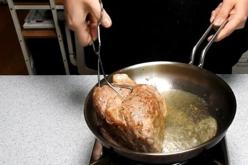 이계피는 3시간 끝에 완성된 세탁시 수비드 통목살 스테이크의 겉을 센 불로 살짝 태우면서 더 익혔다(시어링).