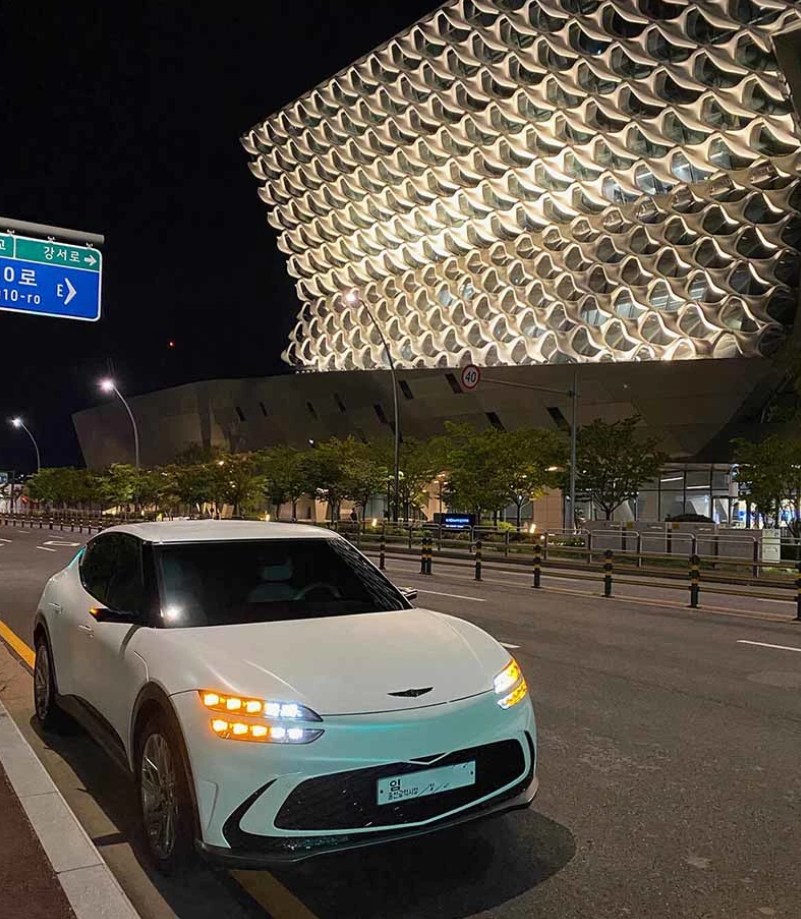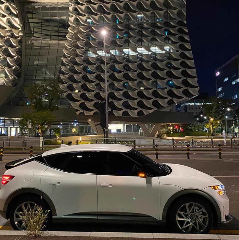 주차되어 있는, “제네시스 GV60를 봤는데.. 진짜, 디자인이 말도 안 되게 끝내줍니다”