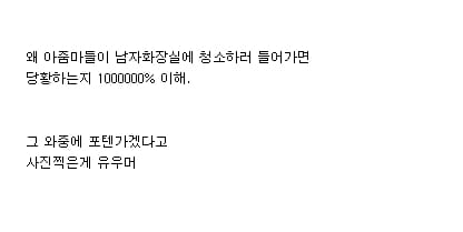이후 글 작성자는 “왜 아줌마들이 남자화장실에 청소하러 들어가면 당황하는지 1000000% 이해”라며 당시 심정을 나타냈다.
