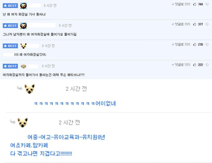 이를 본 누리꾼들은 “아니 남자가 왜 여자화장실에 가?”, “글쓴이가 남자야? 여자야?” 등의 반응을 보이자, 글 작성자는 “나 여중-여고 나온 여자야”라며 상황을 마무리했다.