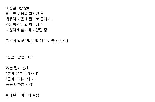 글 작성자는 화장실에 아무도 없는 것을 확인한 후 가운데 칸으로 들어가있는 사이에, 남성 2명이 “점검하겠다”라며 옆 칸으로 들어왔다고 말했다.