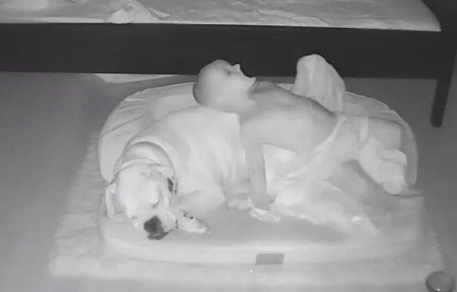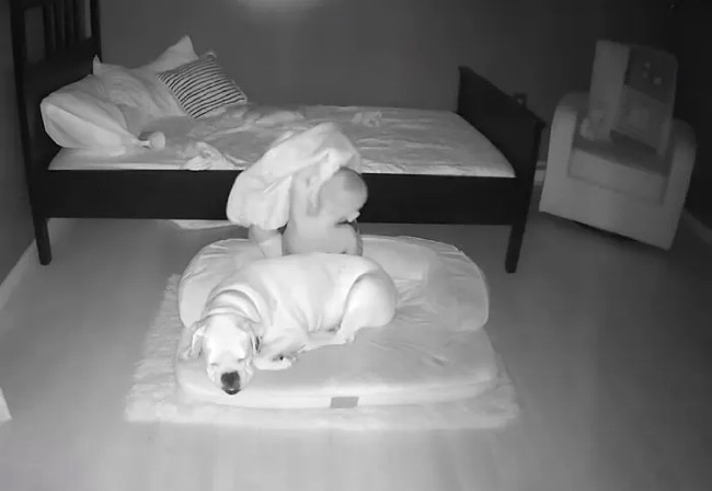 밑의 영상은 댕댕이를 너무 좋아해서 한시도 떨어지기 싫은 아기가 밤에 침대에서 나와 강아지에게 가는 모습이다.