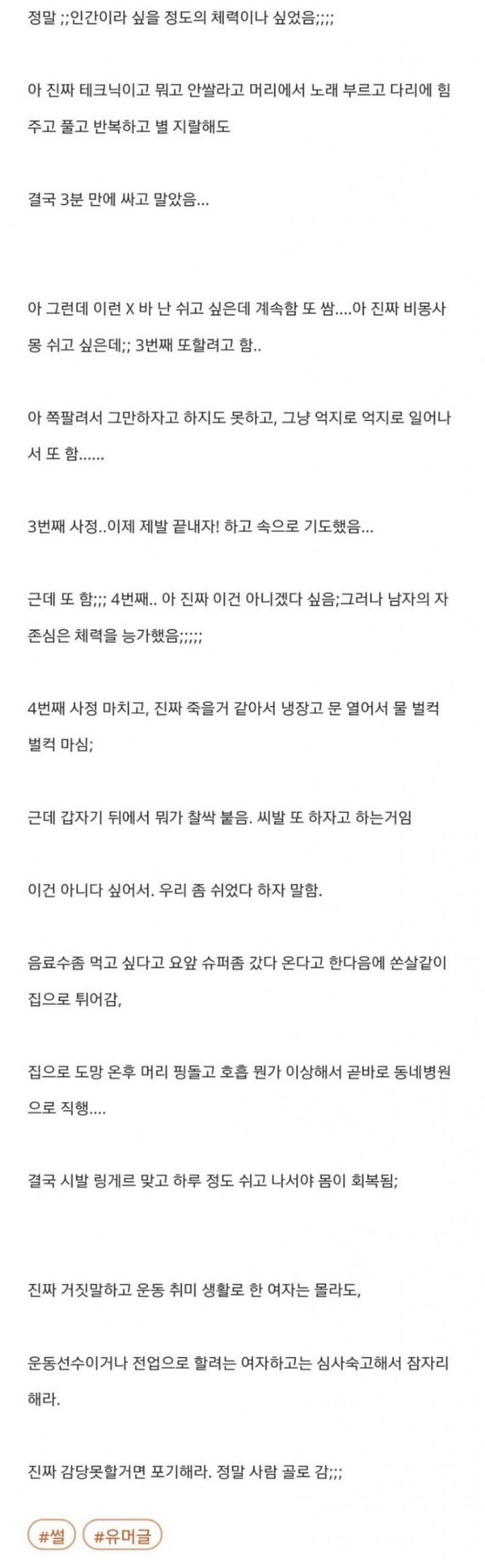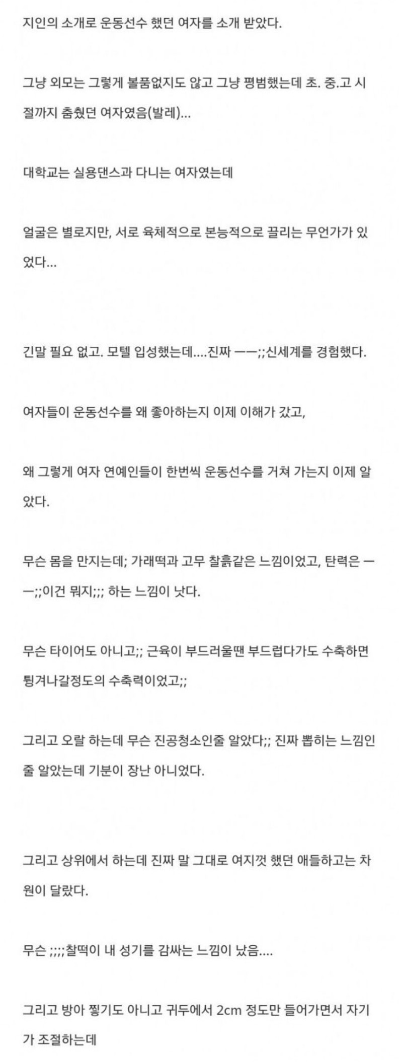 최근 한 온라인 커뮤니티에는 ‘성욕 넘치는 여자 운동선수 만났던 남자’ 라는 제목의 글이 올라왔다.