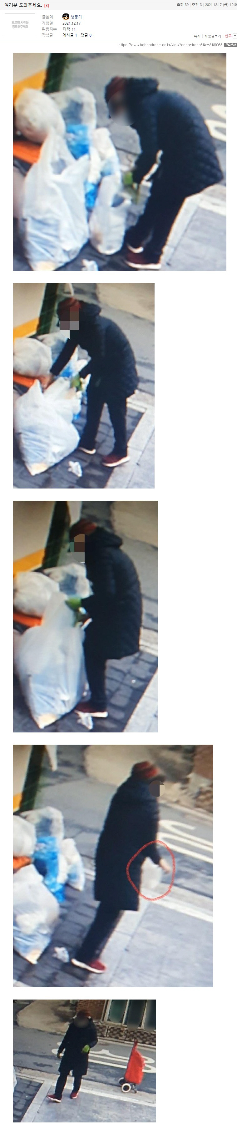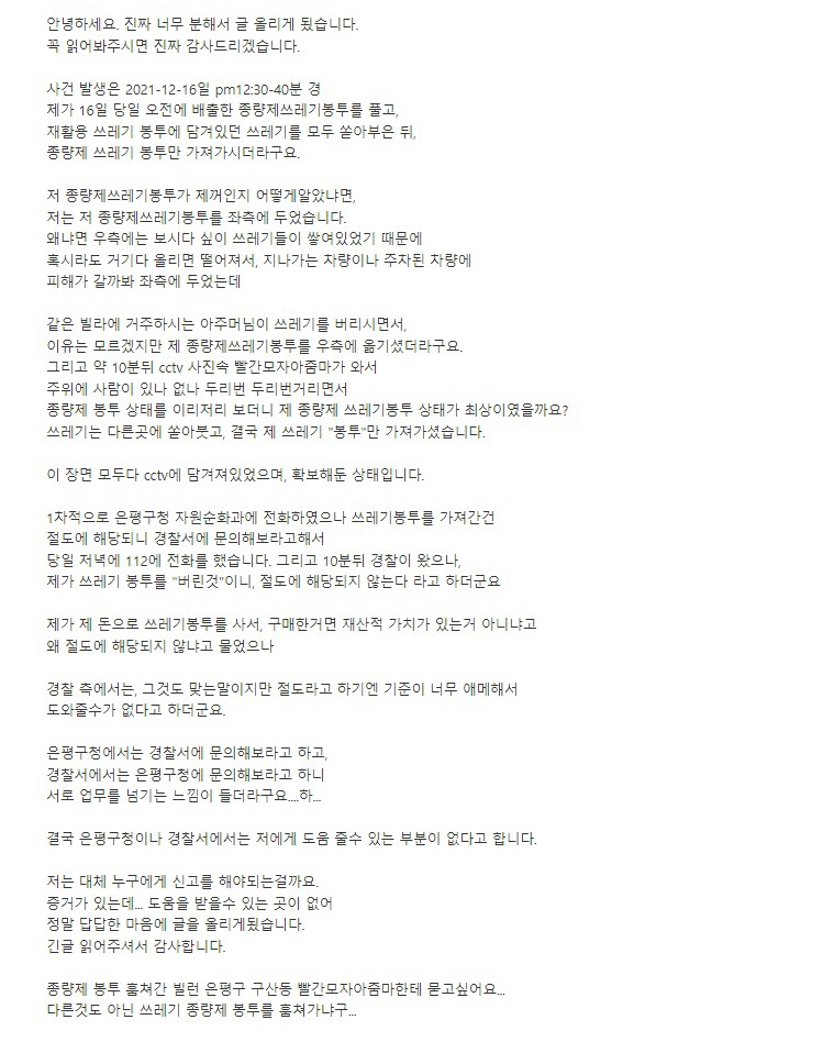 “저는 도대체 누구에게 신고를 해야 하는 건지 모르겠습니다.”, “다른 것도 아닌 쓰레기 종량제 봉투를 훔쳐가다니 어이가 없어요.”라며 당시 상황을 전했다.