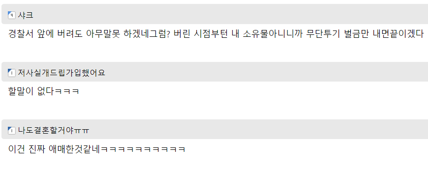 이어서 글쓴이는 “결국 경찰에 신고를 해봤지만 경찰 측에서는 제가 쓰레기봉투를 이미 버린 것이어서 절도에 해당되지 않는다고 답했습니다.”라고 말을 덧붙였다.