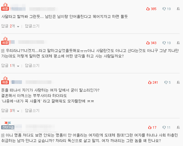 이에 누리꾼들의 반응은 “남친이 사달라고 할까봐 그러네..” “갖고싶으면 니들 돈모아서 사면 되지 명품 안 어울린다고 말했다가 헤어지는 건 무슨 경우..?” “가스라이팅 당하실 뻔하셨네요”등 다양한 반응을 보이고 있다.