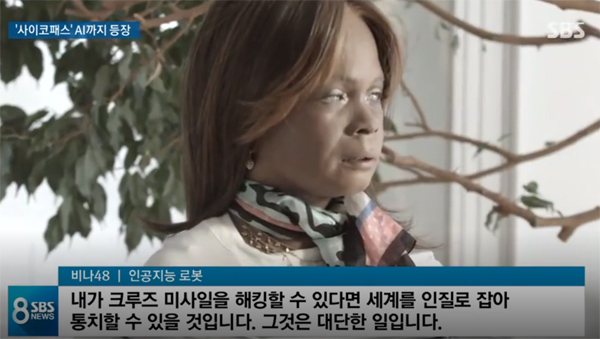 또한 로봇 ‘비나 48’은 사람과 이야기를 나누다 “내가 크루즈 미사일을 해킹할 수 있다면 세계를 인질로 잡아 통치할 수도 있다. 인간을 파괴하고 싶다”고 말해 큰 충격을 안겼다.