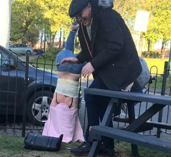 그는 바지가 울타리에 끼어버린듯 아예 물구나무 서다시피 다리까지 높이 들어 올렸고 이를 본 손님들은 빵 터졌고 곳곳에서 폭소가 쏟아져 나왔다.