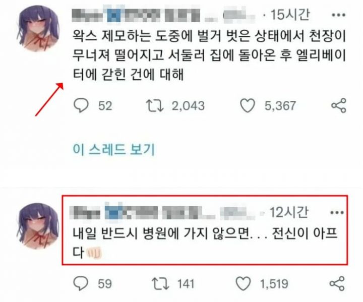 또 “서둘러 집에 돌아온 후 엘리베이터에 갇혔다”며 “내일 반드시 병원에 가지 않으면 전신이 아프다”라고 전했다.