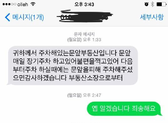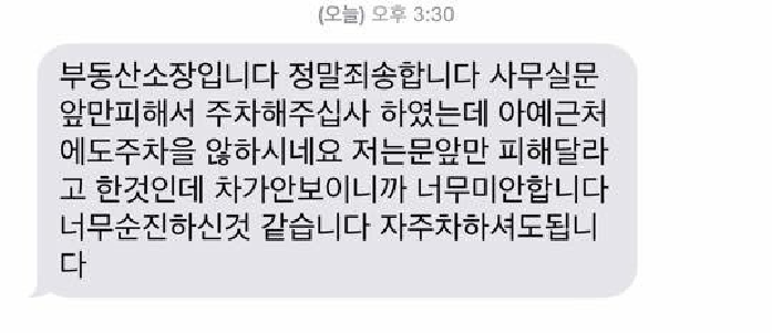 부동산 소장님은 부동산 출입구 바로 앞에 주차한 차량 주인에게 “문 앞을 피해 주차해 주시면 감사하겠습니다”는 문자 메시지를 보냈다.