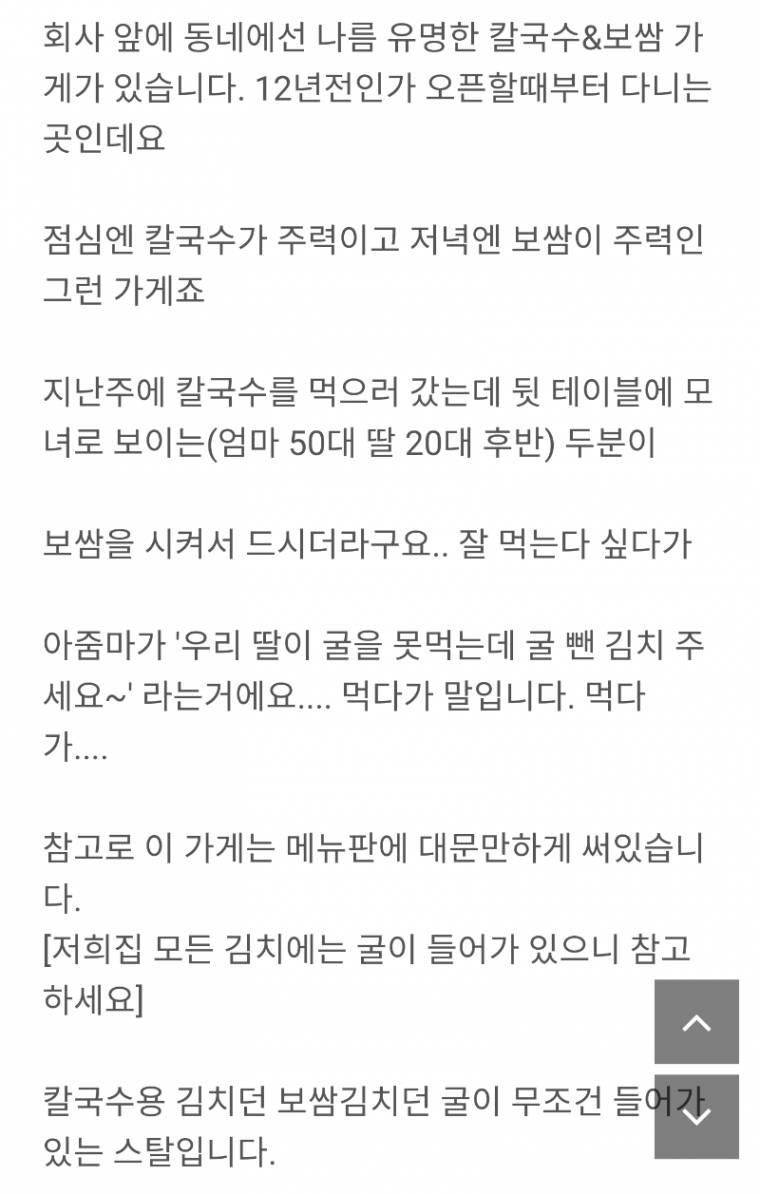 그는 “지난주에 칼국수를 먹으러 갔는데 뒷 테이블에 모녀로 보이는 두분이 보쌈을 시켜서 먹더라”고 설명했다.