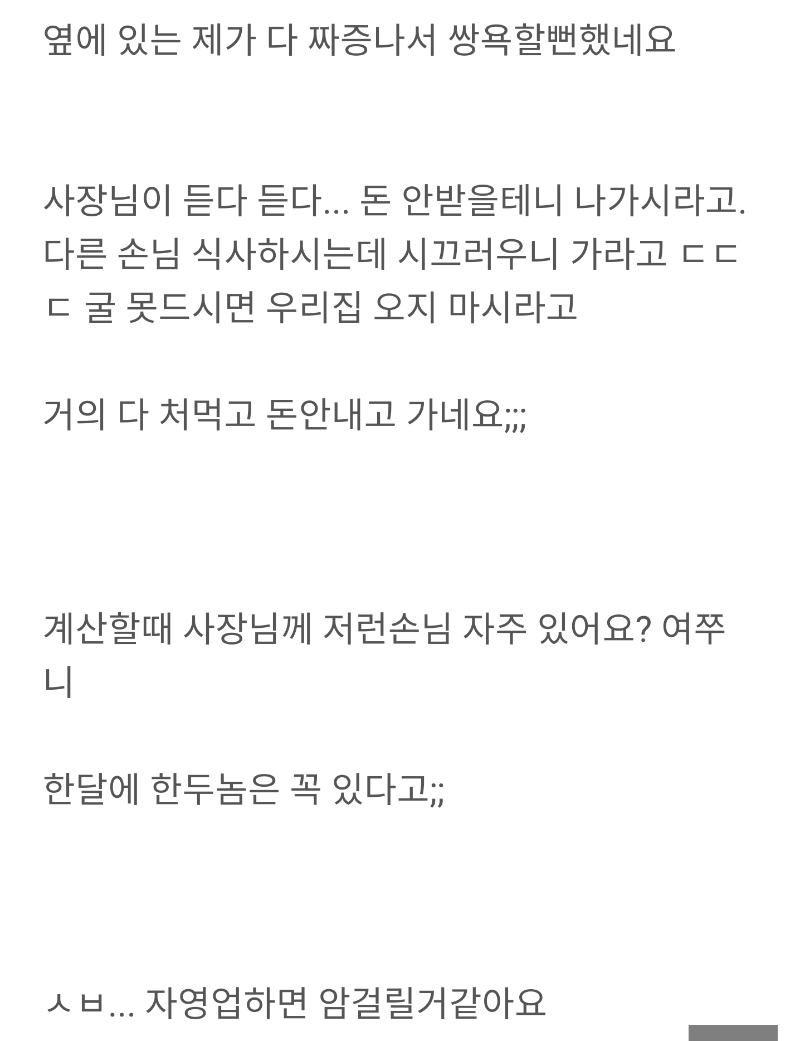이어 “사장님이 듣다듣다 돈 안받을테니 나가시라고 하더라. 거의 다 먹고 돈 안내고 가더라”고 토로했다.
