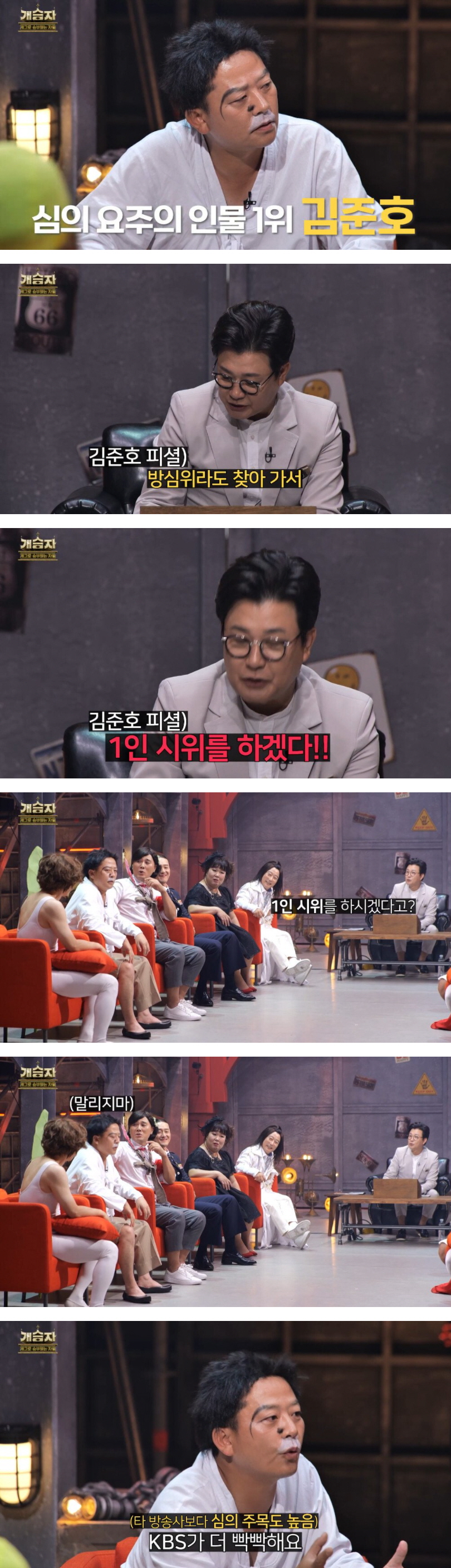 개그맨 김준호는 “타 방송사보다 KBS의 심의가 더 빡빡해서, 방심위라도 찾아가서 1인 시위를 하고 싶습니다.”라며 이야기를 시작했다.