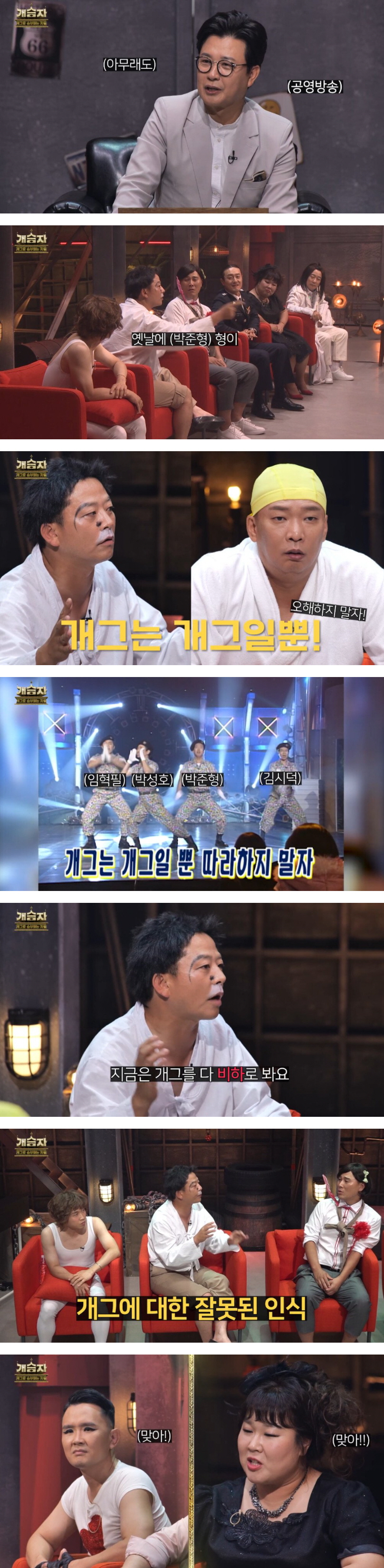 이어서 개그맨 김준호는 “지금은 개그를 다 비하로 보는 경향이 있고, 이거는 개그에 대한 잘못된 인식이다.”라고 말을 덧붙였다.