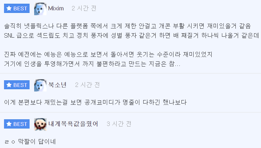 이를 본 온라인 커뮤니티 네티즌들은 “역시 공중파 방송사는 심의가 강한가 보네요. 그래서 다들 유튜브나 넷플릭스, 케이블 방송사로 이동하는 것 같아요.”,”개그맨 여러분들 요즘 개그 프로그램이 없어서 고생 많이 하시더라고요. 정말 다들 힘내세요.”라는 반응을 보였다.