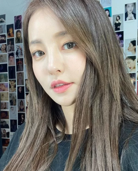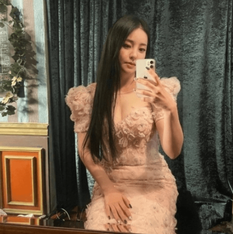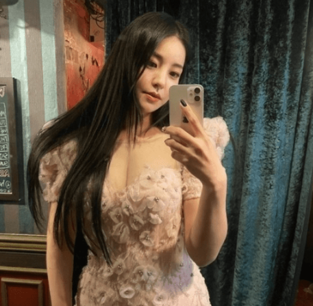 해당 게시물 사진 속 브레이브걸스 유정은 살구색 드레스를 입고 거울 셀카를 찍었다.
