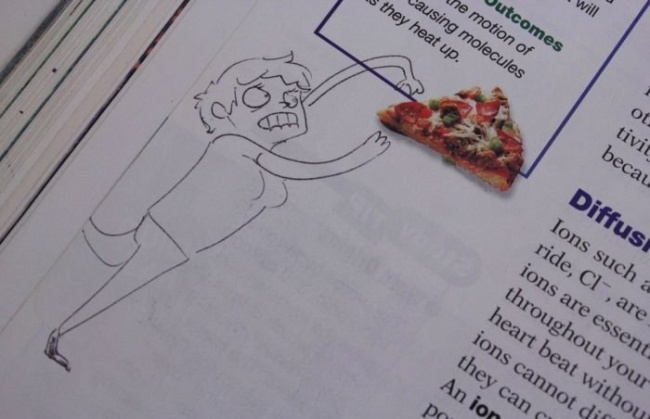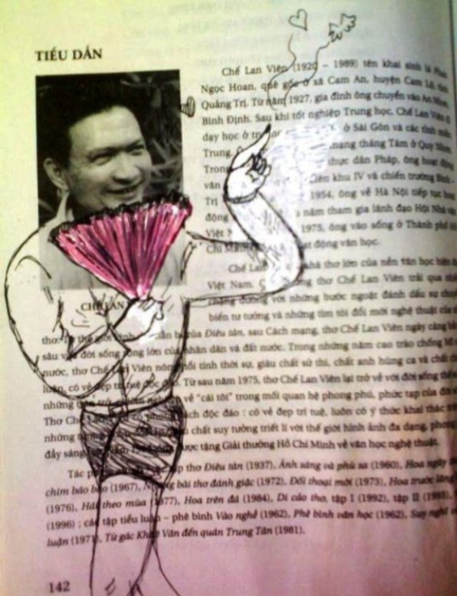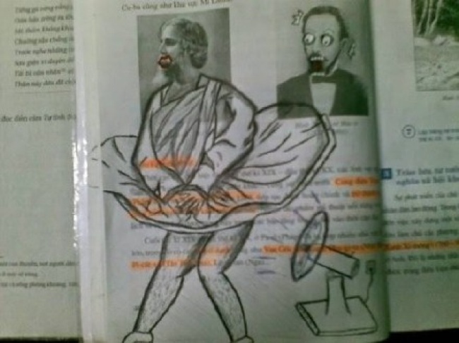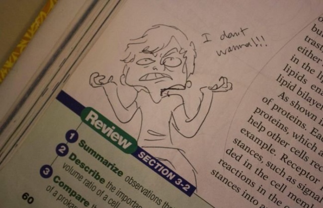 대부분의 낙서는 ‘재미 없다’, ‘언제 끝나지’, ‘졸려’ 같은 것이었지만 가끔 자신의 예술혼을 교과서에 승화시키는 학생들도 있었다.