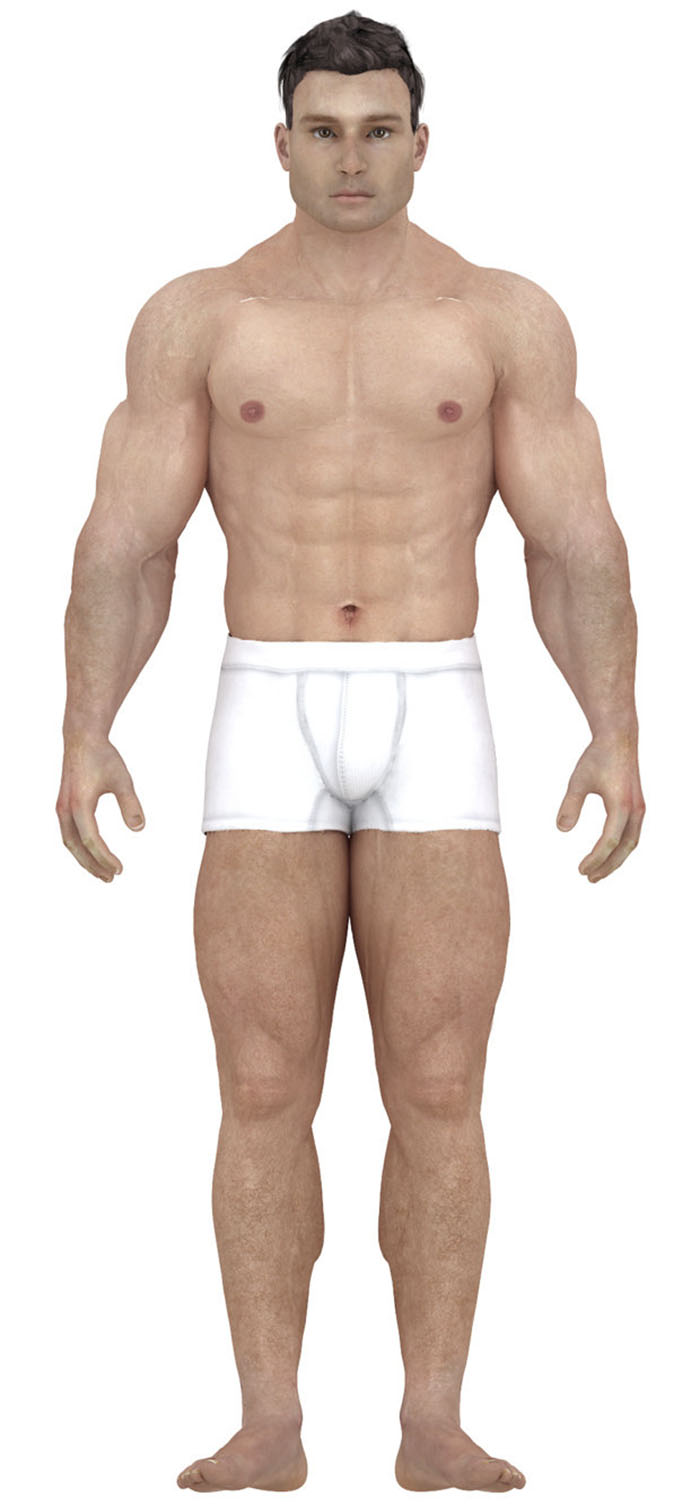 현대의 이상적인 남성의 몸은 딱 벌어진 어깨와 탄탄한 근육, 그리고 식스팩과 같은 단단한 복근 등이다.