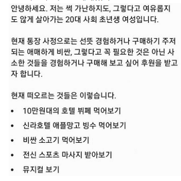 자신이 현재 통장 사정으로 선뜻 경험하거나 구매하기 고민되는 애매하게 비싼 꼭 필요한 것은 아닌 사소한 것들을 경험하거나 구매하고 싶어 후원을 받겠다고 한다.