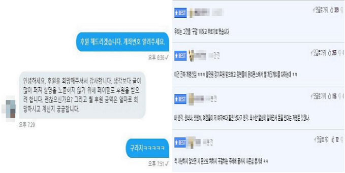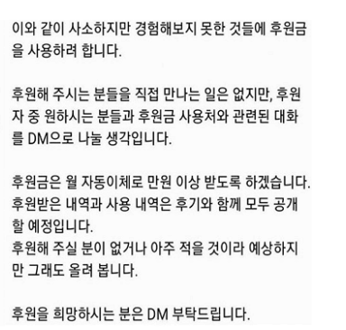 그리고 자신은 후원금을 월 자동이체로 만원 이상 받겠다고 했으며 후원금을 받은 내역, 사용 내역을 후기와 함께 모두 공개하겠다고 밝혔다.