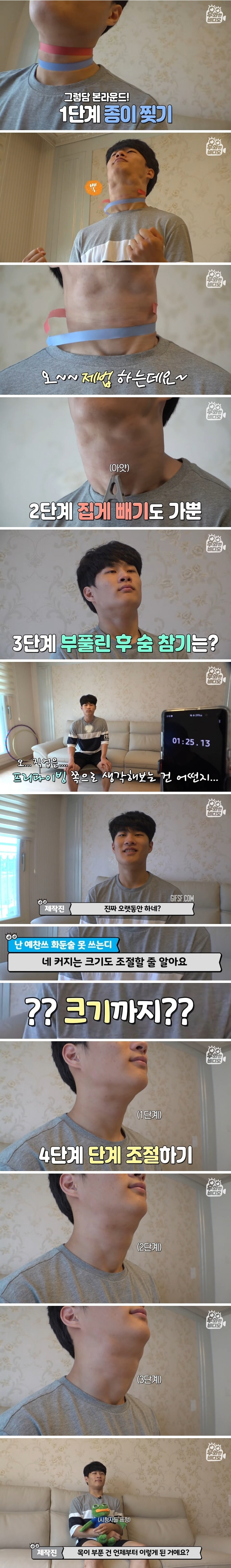 목을 부풀릴 수 있는 남성은 “목에다가 바람을 모아서 목을 부풀린 것이다.”, “막힌 귀를 뚫으려다가 하는 방법을 터득했다.”라며 이야기를 시작했다.