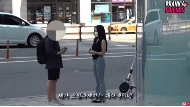 해당 영상에는 미모의 여성은 남성들에게 자신을 조별 과제를 하고 있는 대학생이라고 말을 건 뒤, 인터뷰를 신청하는 모습이었다.