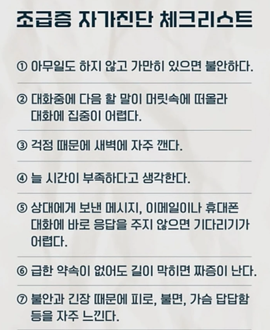 오 박사는 “요즘 삶이 바쁘다 보니 주변에 조급증을 겪는 이들이 많다”며 조급증 판별 체크리스트 7가지를 문답을 보여줬다.