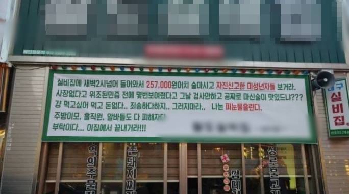 술집을 운영하는 대표 A 씨는 대구시 행정심판위원회 영업정지 처분 취소신청을 제출했으나 무효가 됐다고 전해졌는데 판결에 불복한 A 씨는 술집에 현수막을 내걸면서 “25만 7천원어치 술 마시고 자진 신고한 미.성.년자는 보아라”라며 “위조된 주민등록증 몇 번 보여줬다고 그날 검사 안 하고 마신 공짜 술이 맛있었느냐”고 적었다.