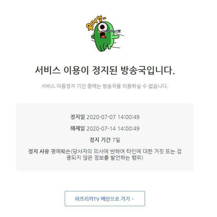 아프리카 tv는 “명예훼손 (당사자의 의사에 반하여 타인에 대한 거짓 또는 검증되지 않은 정보를 발언하는 행위)”의 이유로 그를 오는 14일까지 7일간 정지시켰다.