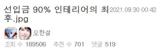 작성자 A씨는 “선입금 90% 인테리어의 최후” 라는 제목의 글로 많은 이들의 궁금증을 증폭시켰다.