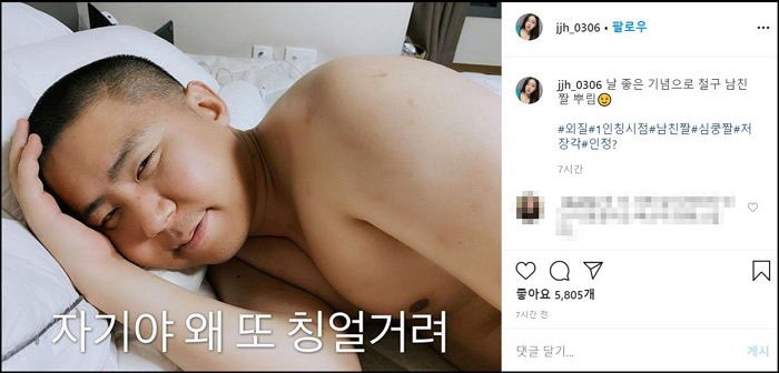 27일 BJ외질혜는 자신의 인스타그램에 “날 좋은 기념으로 철구 남친짤 뿌림”이라며 ‘1인칭 시점’, ‘남친짤’이라는 해시태그와 함께 사진을 게재했다.