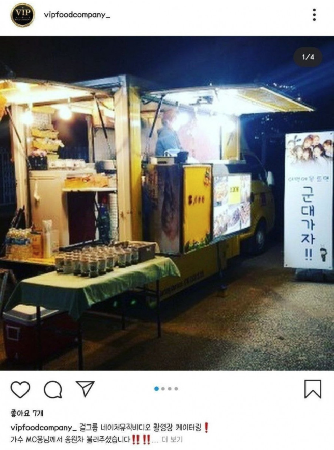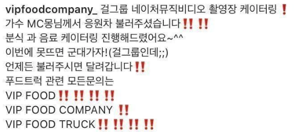 지난 2일 푸드트럭 업체인 ‘vipfoodcompany’ 인스타그램 계정에는 “걸그룹 네이처뮤직비디오 촬영장 케이터링! 가수 MC몽님께서 응원차 불러주셨습니다!”라는 글과 함께 사진이 올라왔다.