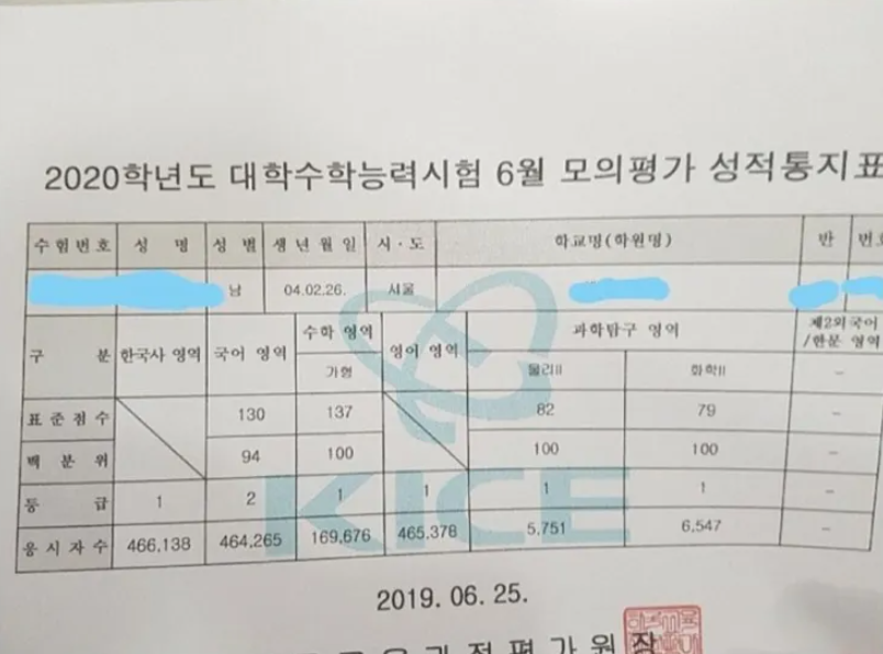 그는 2020학년도 대학 수학능력시험 성적 통지표도 업로드했는데 영어 영역이 2등급이고, 그 외 모든 과목을 전부 1등급을 받았다.