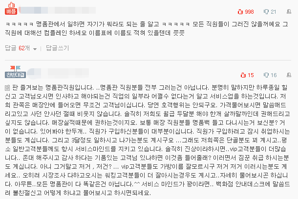 이에 누리꾼들은 “명품판다고 니네가 명품이냐 ㅋㅋ” “잘하는 백화점 직원까지 욕 먹는거야 이러니까” “직원들 콧대 높네” 등 다양한 반응을 보였다.