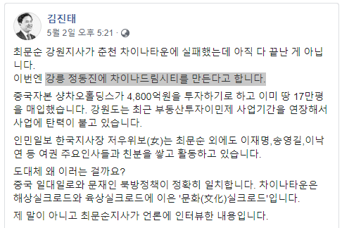앞서 지난 3일 김진태 전 국민의힘 의원은 정동진 차이나 드림시티를 언급하며 “중국 자본 샹차오홀딩스가 4,800억 원을 투자하기로 하고 이미 땅 17만 평을 매입했다”고 밝혔다.
