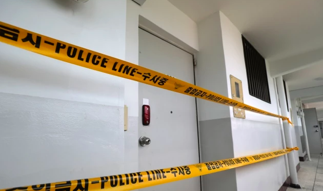 사건이 발생한 아파트 출입문에 현장 보존을 위한 폴리스 라인이 설치돼 있다.