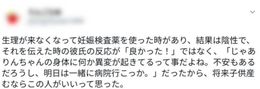 A씨는 생리를 안하길래 검사를 했더니 음성이었고 해당 사실을 전하니 남자친구는 다행이다가 아닌 여성의 몸를 걱정하는 반응을 보였다.