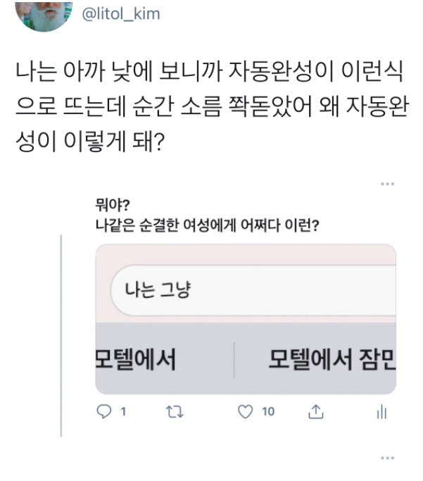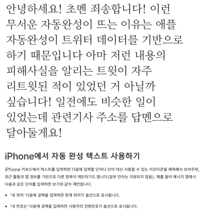 최근 온라인 커뮤니티에 올라온 “아이폰 자동완성 논란”라는 제목의 게시글이 화제다.