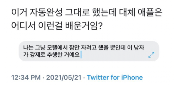 이를 본 온라인 커뮤니티 네티즌들은 “나도 아이폰 자동완성 기능 쓰는데 저 문장과 똑같이 완성이 됩니다. 신기하네요.”, “애플이 자동완성을 트위터 데이터 기반으로 하는걸로 알고 있습니다. 그래서 저런 내용이 나오는 거 아닐까요? 근데 좀 무섭긴 하네요.”라는 반응을 보였다.